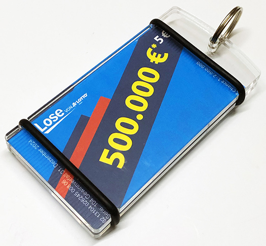 Ins Schlüsselanhänger-Standardformat passen fast alle europäischen Brieflos-Formate (manche muß man einmal falten). Mehr Information dazu >
