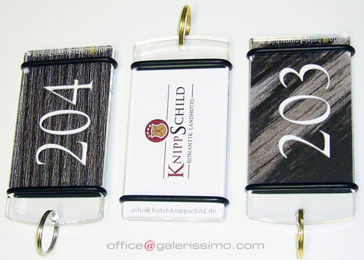 "Nur Zimmernummer" war gestern: GALERISSIMO Schlüsselanhänger sind ein günstiges und erfolgreiches Medium. Auch zum Hotelgast, weil sie mehrmals täglich zur Hand genommen werden. Bei diesen guten Gelegenheiten wecken sie "nebenbei" Interesse, informieren, bieten an, motivieren, ...